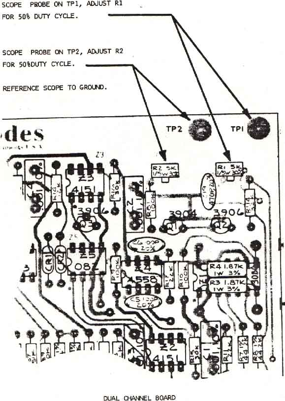 - Set the pulse width of each oscillator on all Dual Channel Boards. The pulse width should be set to equal the pulse interval yielding a 50% duty cycle. Connect a scope between TP 1 of a Dual Channel Board and ground. Set up a scratch program and adjust the pulse width parameter to 32 (50% value). Initialize the Chroma with a set split "50" then adjust pot, R1 for a 50% duty cycle. Move the scope probe to TP 2, adjust R2, etc. for all 16 oscillators.