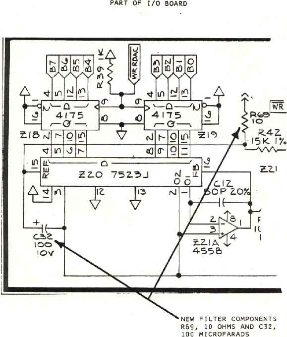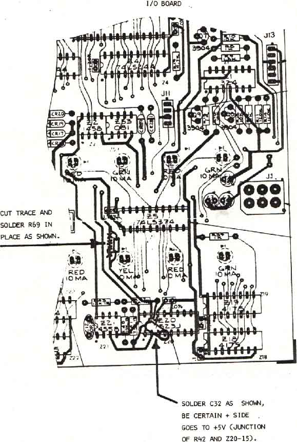 On the I/O Board cut the trace between the junction of R42 and Z20, Pin 15 and the +5V analog bus from J1, Pin 4. Install R69, 10 OHM, 5% as shown on the I/O components drawing. Install C32, 100uf, 10V (also shown on the I/O components drawing). Be certain to solder the + lead of the capacitor to the junction of R42 and Z20, Pin 15.