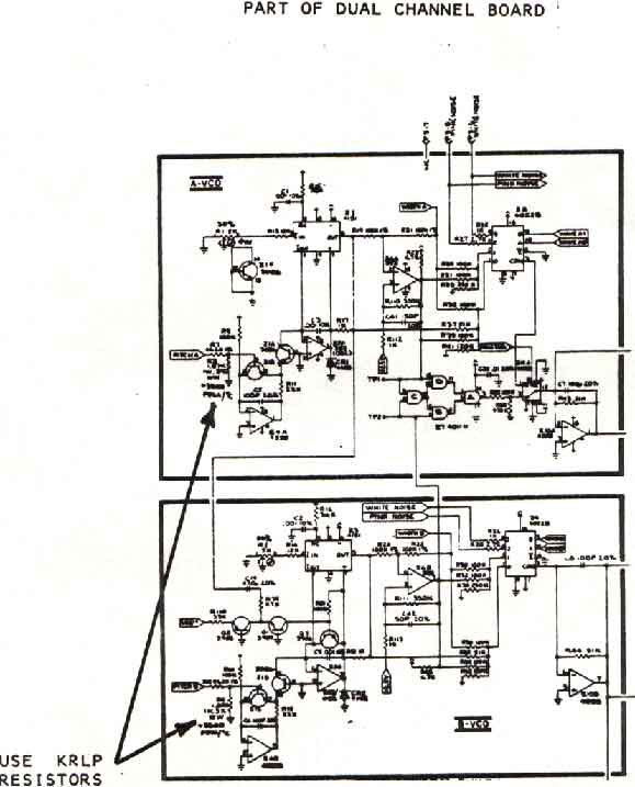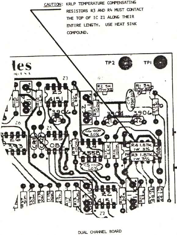 2. Temperature compensating resistors are mounted on top of the 3086 oscillator chip on the Dual Channel Board to correct for thermal changes. On Chromas having the affected serial numbers, these resistors are from two vendors. Those resistors marked Tel Labs do not correct quickly enough and should be changed. Those resistors marked KRLP react faster and should be changed only if they are misaligned or do not have heat sink compound under them used for better thermal transfer. The resistors may be readily identified by their size. When mounted parallel against each other and placed directly on the 14 pin dip chip (3086, Z1) the KRLP resistors will not overhang but the Tel Labs resistors have a larger diameter and overhang the chip. This is readily apparent at a glance [see Voice Board Revisions: TEMPCO Resistors for pictures]. Note also the resistors should be aligned parallel to the edge of the chip so they do not overhang and must be down against the top of the chip evenly along their length.