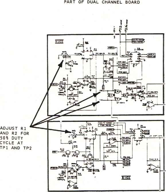 - Set the pulse width of each oscillator on all Dual Channel Boards. The pulse width should be set to equal the pulse interval yielding a 50% duty cycle. Connect a scope between TP 1 of a Dual Channel Board and ground. Set up a scratch program and adjust the pulse width parameter to 32 (50% value). Initialize the Chroma with a set split "50" then adjust pot, R1 for a 50% duty cycle. Move the scope probe to TP 2, adjust R2, etc. for all 16 oscillators.