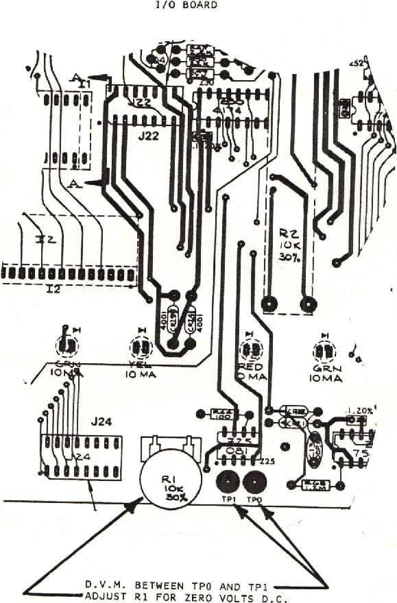 - Connect a digital D.C. voltmeter (100 microvolts resolution minimum) between TP 0 and TP 1 on the I/O Board (see components drawing). Do not reference the voltmeter inputs to ground. Set the adjacent potentiometer for 0 VDC. This pot, R1, adjusts the offset null to the output op amp of the 12 bit DAC and must be nulled for proper tuning.