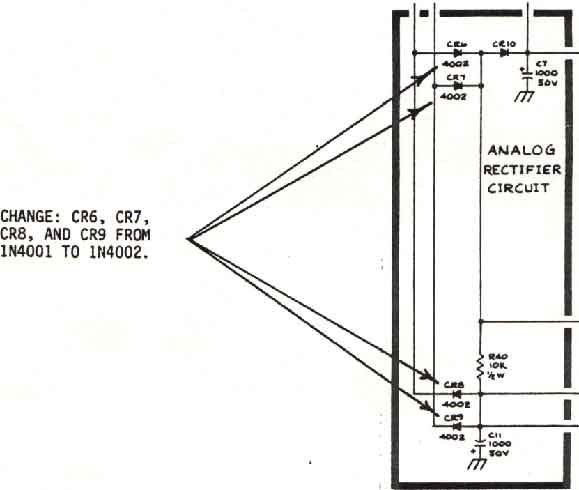 Remove four 1N4001, 1A, 50V PIV, diodes CR6, CR7, CR8 and CR9. Replace them with 1N4002, 1A, 100 PIV diodes. CR10 does not need to be changed. Refer to Table One.