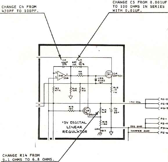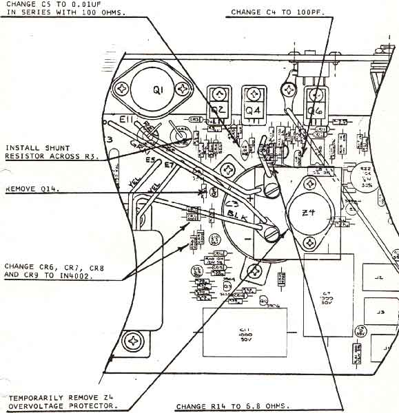Remove C5, 0.00luf and replace it with a series network consisting of a 100 OHM, 1/4W, 20% resistor in series with a 0.01uf, 50V, 20% disc ceramic capacitor. Remove C4, 470pf and replace it with a 100pf, 50V, 10% disc ceramic capacitor. Remove R14, 9.1 OHM and replace it with a 6.8 OHM, 1/4W, 5% resistor. Refer to Table Two.