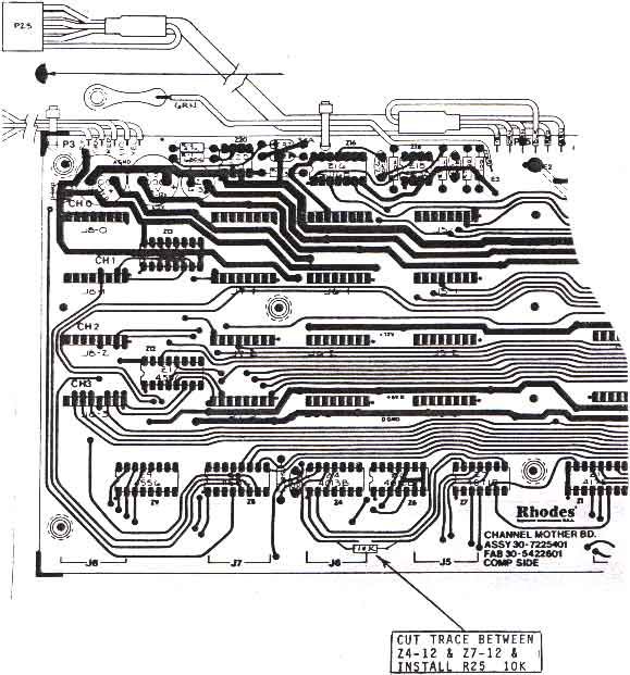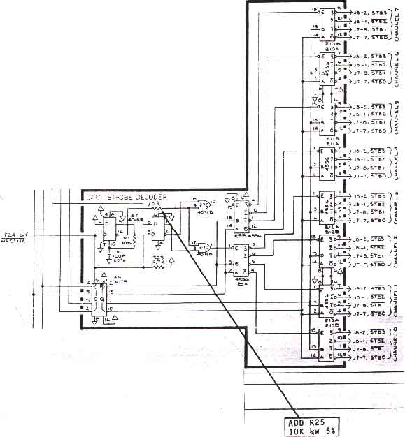 Cut trace between Z4-Pin 12 and Z7-Pin 12 in the Data Strobe Decoder on the Channel Mother Board (components side) adn install R25, a 10K OHM< 1/4W, 5% Resistor. See drawings.