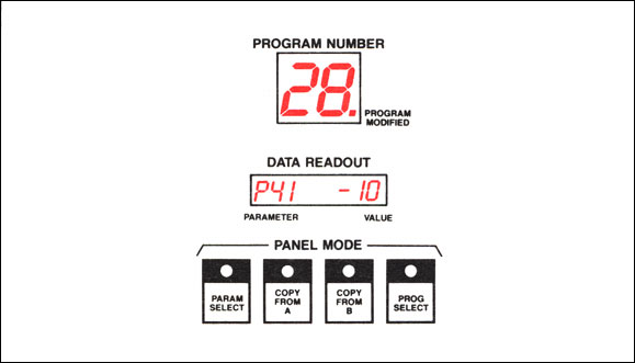 Whenever a program is selected, it gets copied into the "current program" workspace and the PROGRAM NUMBER display is updated. Whenever a program is stored, the current program is copied from the workspace into one of the 50 stored program locations, and the PROGRAM NUMBER display is updated. In both of these cases, the current program will be identical to the stored program. However, as soon as any aspect of the current program is changed, the current program no longer equals the stored program. (Remember, the number display is always the number of the stored program.) When any modification, no matter how slight, is made to the current program, an indicator (called the MODIFIED FLAG) will be used to indicate that the program has been changed. The MODIFIED FLAG appears as a decimal point in the lower right hand corner of the PROGRAM NUMBER display. This is to remind you that you must store the current program if you want to retain the new control settings. If a new program is selected, or a store takes place, the MODIFIED FLAG will be turned off.