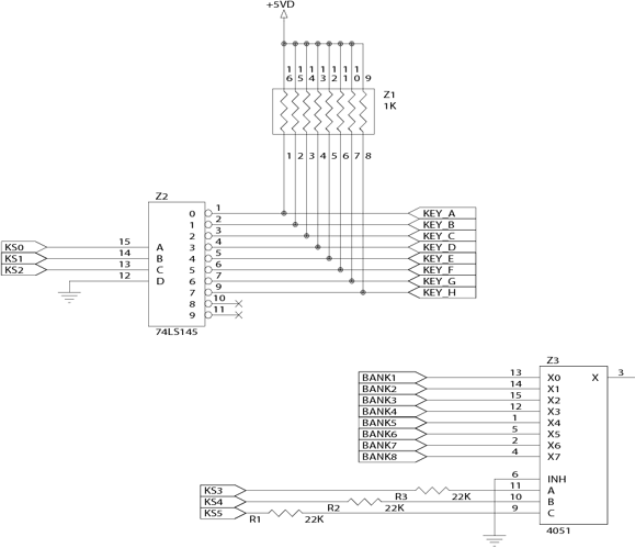 Z2 (a 1-of-10 decoder/driver) uses signals KS2 - KS0 to select one of 8 outputs. These outputs are pulled up to 5V (through resistor pack Z1) when not selected - and are driven low when selected. The three binary bits of KS2 - KS0 select one of eight columns (KEY_A through KEY_H).