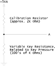 Figure 8 is a pictorial representation of the individual key sensors in the Chroma. Each key's sensor behaves as a variable resistance, with infinite resistance at 'no pressure.'