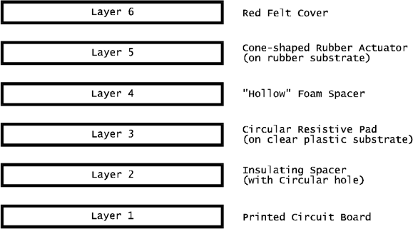 The following sections discuss the implementation of each of the 6 layers. For the sake of discussion, the diagrams will show the interface for a single key. (In practice there are actually 64 such areas on the pressure sensor.)